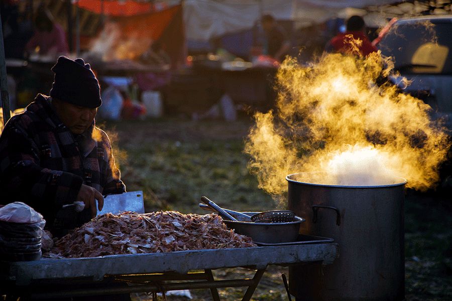 臘八節(jié),午夜剛過,他就和家人搬出擦得锃亮的銅鍋,把預(yù)先泡過的五谷雜糧如小米、紅豆、紅棗、桂圓等開始熬煮,待到臘八早晨每人一大碗,唏哩呼嚕地喝個盡興;