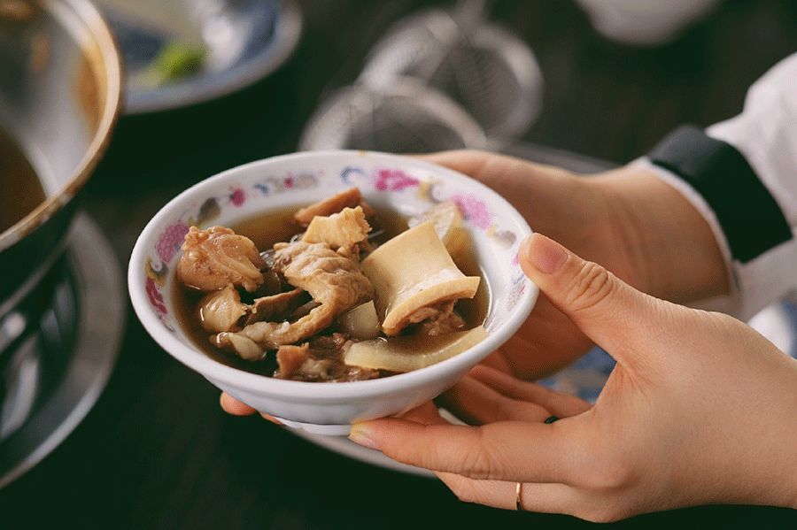 “一個大鐵鍋,口徑二三尺,熱騰騰地端上來,里面還在滾沸。一層雞、一層鴨、一層肉、一層油豆腐,點綴著一些蛋餃,還有蘿卜、青菜,味道好極?!?/span>