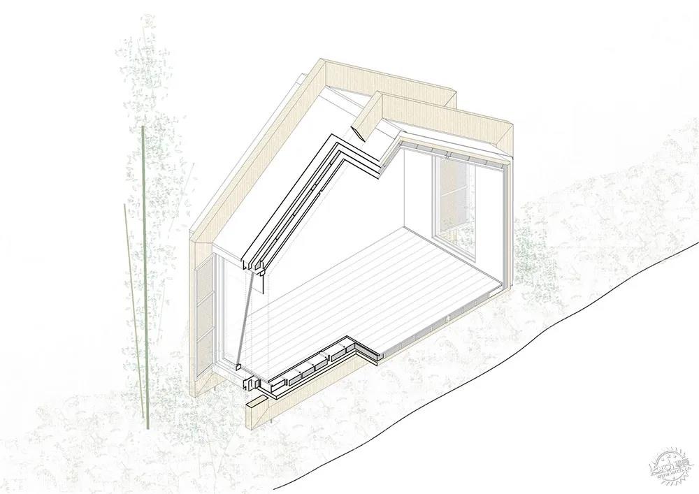 代表性與象征性形象。在建筑的外部,建筑師通過技術(shù)和形式來表達(dá)整體的代表性與象征性特征,建筑師希望項(xiàng)目簡約、干凈、優(yōu)雅,并且通過緊湊的山墻體量構(gòu)成了建筑的原型。項(xiàng)目較為抽象,白色的體量強(qiáng)調(diào)了木制結(jié)構(gòu)的特征,展館的概念也很好地表達(dá)了其空間本質(zhì),即建筑。