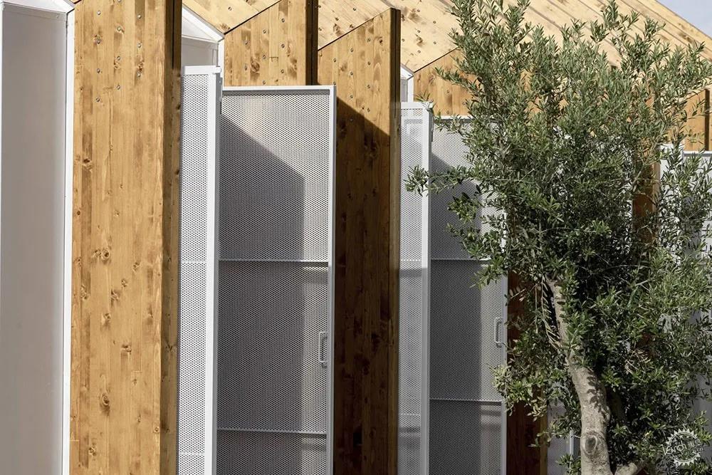 這是一個(gè)干燥的工業(yè)化木結(jié)構(gòu),能夠保證質(zhì)量,對于環(huán)境的影響低,但是有著一定的效率、經(jīng)濟(jì)效益,以及結(jié)構(gòu)設(shè)計(jì)精準(zhǔn)度。與此同時(shí),這種體系便于運(yùn)輸、調(diào)試、裝卸,為了滿足這些需求,結(jié)構(gòu)、天花板、立面、技術(shù)樓層的綜合網(wǎng)絡(luò)和空調(diào)之間的協(xié)調(diào)必不可少。在建筑內(nèi)部,項(xiàng)目的最后一層覆蓋了與展館中建筑部分相同的完成面。