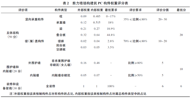 鑒于剪力墻結(jié)構(gòu)在我國(guó)的普及性,本文以裝配式剪力墻結(jié)構(gòu)體系為研究對(duì)象,通過(guò)對(duì)我國(guó)11項(xiàng)代表性裝配式建筑工程的統(tǒng)計(jì)分析,得出裝配式建筑剪力墻結(jié)構(gòu)的外部權(quán)重和內(nèi)部權(quán)重,以及評(píng)級(jí)標(biāo)準(zhǔn)規(guī)定的單項(xiàng)構(gòu)件預(yù)制率的最低要求,結(jié)合《標(biāo)準(zhǔn)》評(píng)分表,剪力墻結(jié)構(gòu)預(yù)制構(gòu)件率最低要求和相應(yīng)權(quán)重如表2所示。