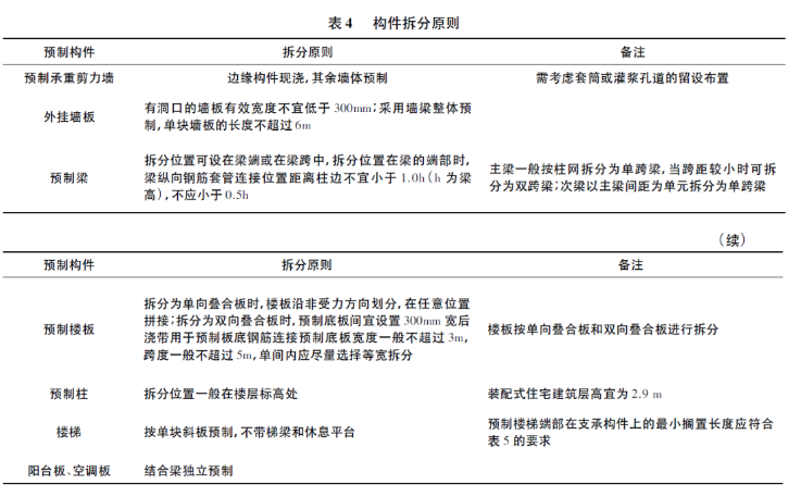 裝配式建筑構(gòu)件拆分是設(shè)計(jì)的關(guān)鍵環(huán)節(jié),根據(jù)《預(yù)制預(yù)應(yīng)力混凝土裝配式整體式框架結(jié)構(gòu)技術(shù)規(guī)程》JGJ224-2010和相關(guān)文獻(xiàn)中的規(guī)定,對(duì)構(gòu)件的拆分一般遵循“少規(guī)格、多組合”的原則,具體規(guī)定見(jiàn)表4。