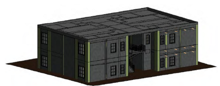 本工程為兩層剪力墻結(jié)構(gòu)住宅,共計(jì)4戶(hù),二類(lèi)建筑,采用65㎡標(biāo)準(zhǔn)化戶(hù)型模塊,建筑總面積570.16㎡,共兩層,采用裝配剪力墻結(jié)構(gòu)體系,目標(biāo)裝配率為78%,AA級(jí)裝配式建筑,工程全裝修。圖4為本工程的BIM三維圖。