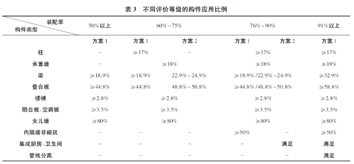 此外,通過(guò)統(tǒng)計(jì)分析,得到不同評(píng)價(jià)等級(jí)對(duì)應(yīng)的構(gòu)件應(yīng)用比例(如表3) ,因預(yù)制構(gòu)件中梁、板對(duì)裝配率影響最大,所以裝配率的變化主要以調(diào)整梁、板應(yīng)用比例為主