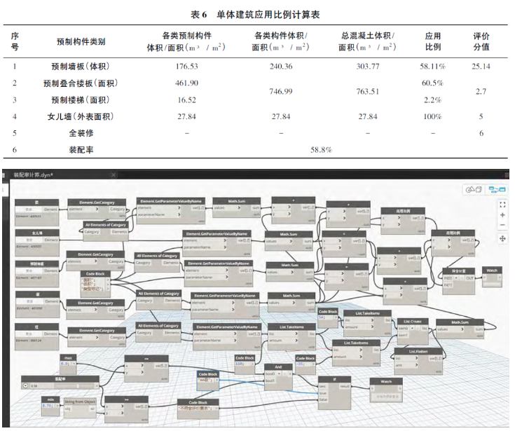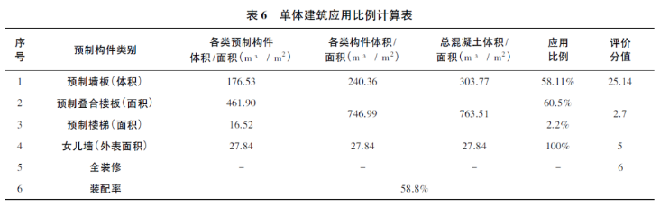 當(dāng)樓梯、內(nèi)墻、剪力墻、疊合板、女兒墻等構(gòu)件分別采用預(yù)制構(gòu)件的情況下,利用BIM通過(guò)計(jì)算規(guī)則計(jì)算預(yù)制部品部件的應(yīng)用比例,其應(yīng)用比例計(jì)算結(jié)果見(jiàn)表6。