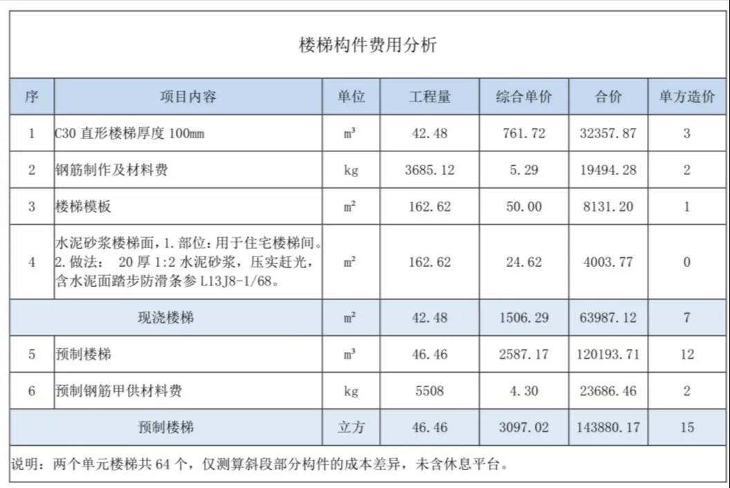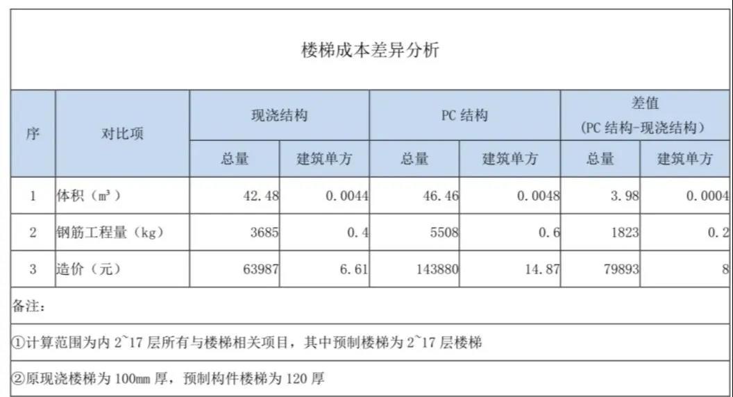 以下以其中某一棟高層住宅為例,依次分析樓梯、樓板、外墻、內(nèi)墻四個(gè)部品部件的成本增量。