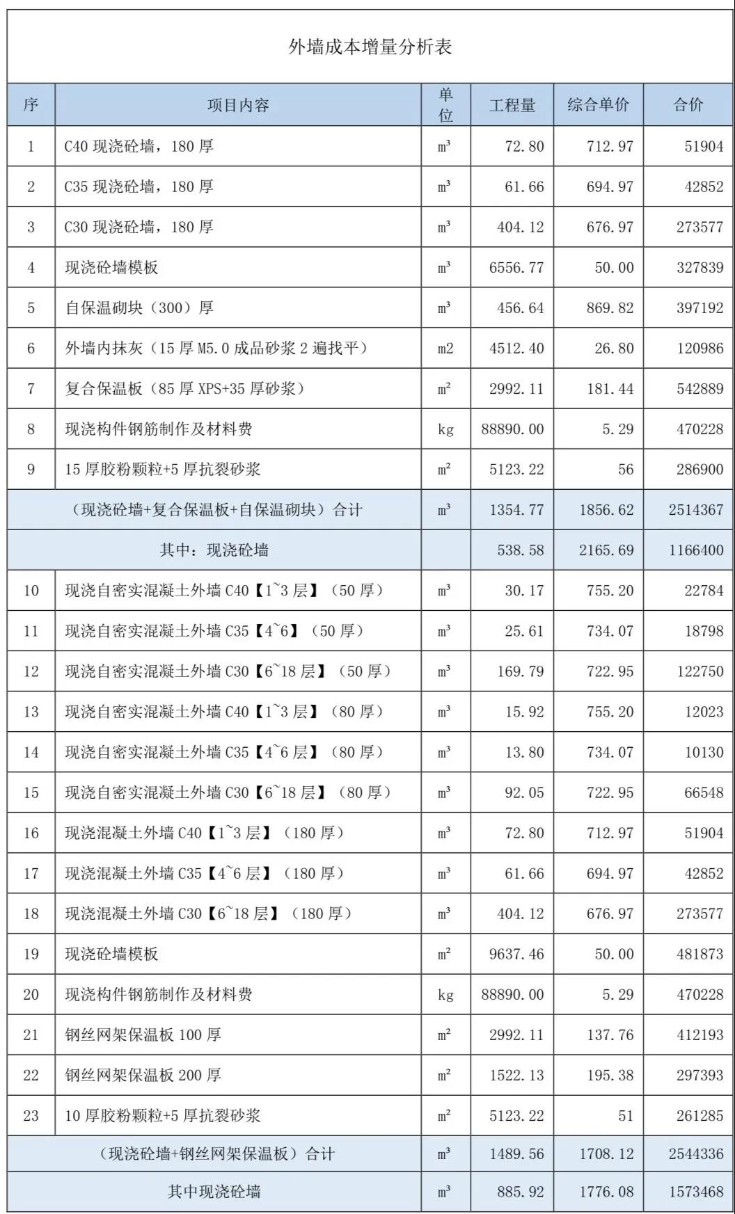 (3)鋼絲網(wǎng)架現(xiàn)澆砼復(fù)合保溫系統(tǒng)的成本增量大小受原保溫系統(tǒng)做法的影響較大。(4)結(jié)構(gòu)工程量含量指標(biāo)對(duì)比分析表