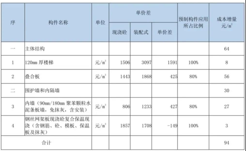剪力墻結(jié)構(gòu)體系(單體裝配率51%)其中兩項(xiàng)成本增量匯總表,如下表: