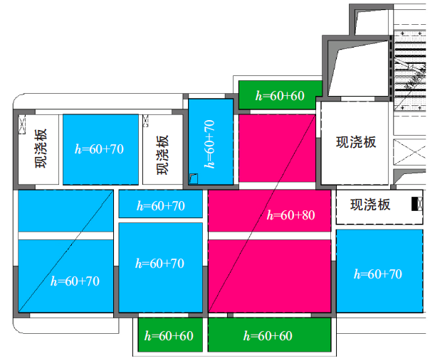 住宅標(biāo)準(zhǔn)層內(nèi)不同板塊對應(yīng)不同功能區(qū),如陽臺、臥室、廚房、客廳、餐廳、玄關(guān)、公共區(qū)域等,通常不同功能區(qū)疊合板現(xiàn)澆疊合層需暗敷的電氣管線數(shù)量不同,對現(xiàn)澆疊合層的空間需求也不同。因此,電氣管線敷設(shè)較少的區(qū)域可采用厚120mm(如陽臺)和130mm(如一般臥室、廚房等)疊合板;電氣管線敷設(shè)較多的區(qū)域宜采用不小于140mm厚的疊合板(如客廳、玄關(guān)、公共區(qū)域等)。對于有陽角的異形板,由于需額外布置陽角放射筋,對現(xiàn)澆疊合層空間需求增加。因此,建議該區(qū)域疊合板厚適當(dāng)加厚,一般不宜小于140mm,如圖8所示。