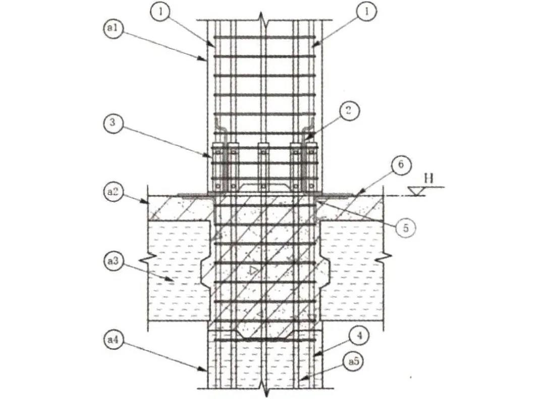 1.上部預制柱主筋;2,Ф10圓鋼;3.-40 X 4鍍鋅扁鋼;4.下部預制柱主筋;5.Ф10圓鋼;a1.上部預制柱;a2.下部預制柱;a3.灌漿套筒
