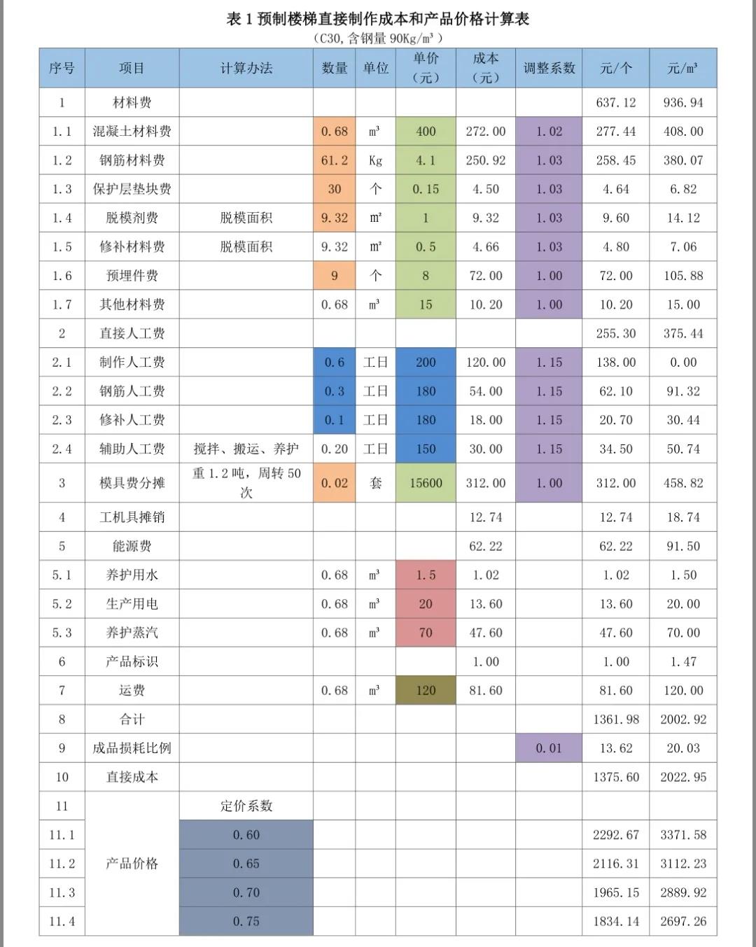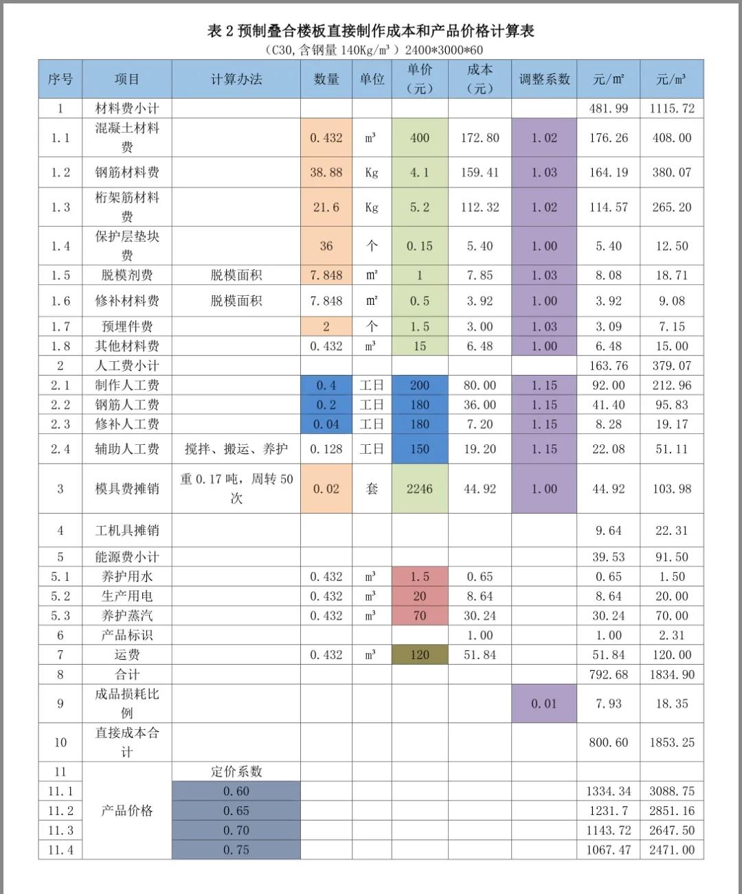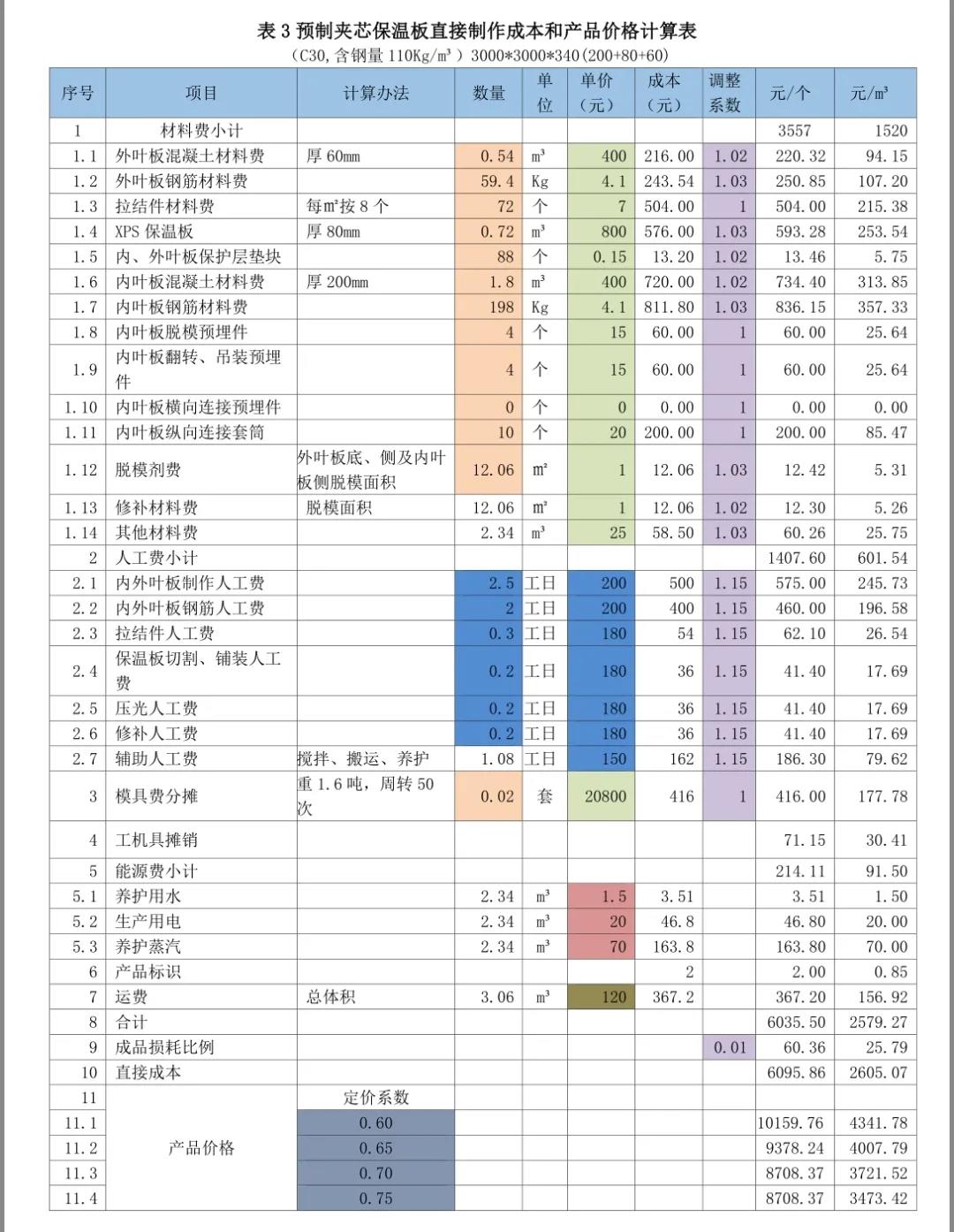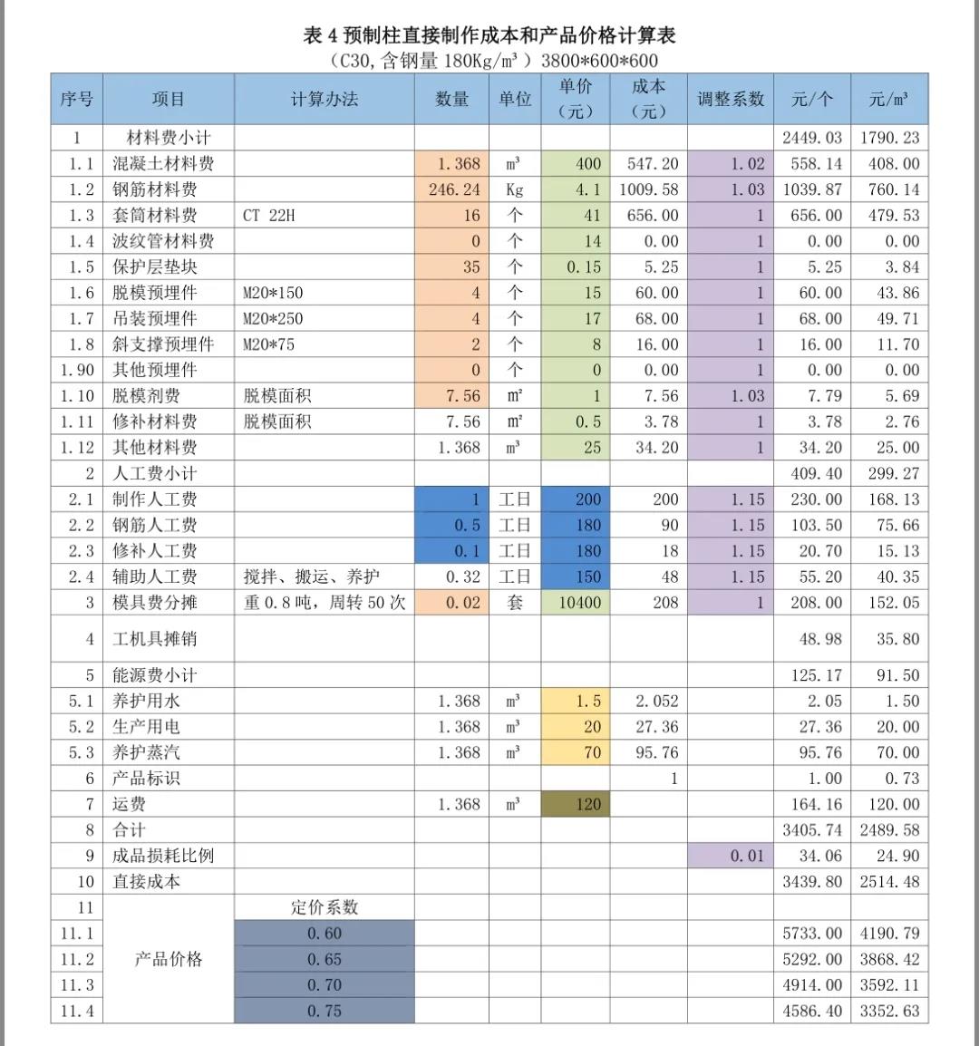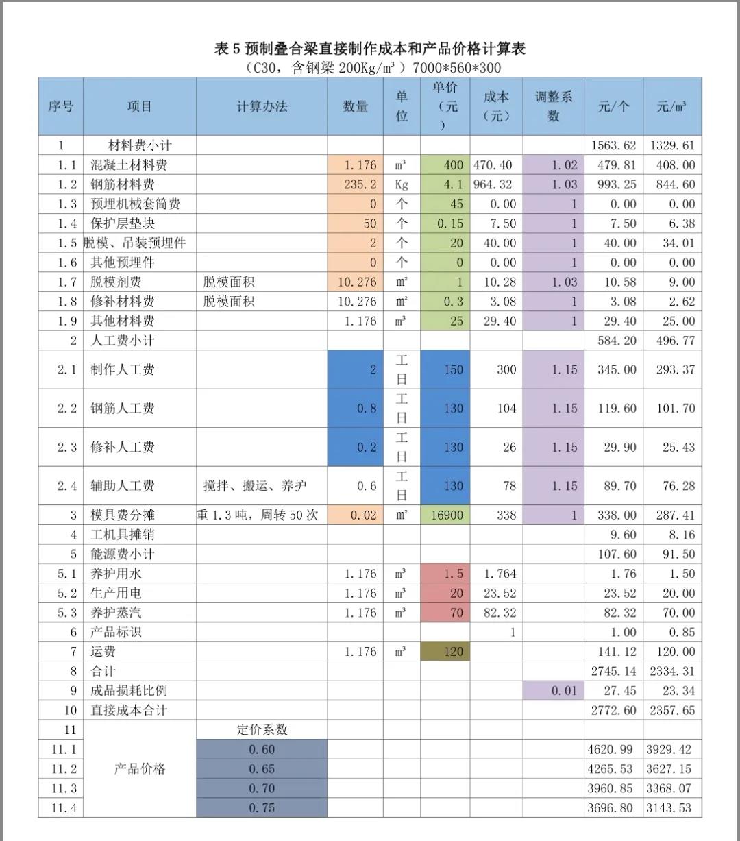以下分享摘自紅寶書之《裝配式混凝土建筑——如何把成本降下來》,是從構(gòu)件廠家的角度進行的價格組成介紹,亦可用于對預(yù)制構(gòu)件價格合理性判斷的方法。(1)預(yù)制構(gòu)件銷售價格的計算方法和步驟我們計算預(yù)制構(gòu)件價格的步驟一般是以下四步:2)然后計算費用(包括間接制作成本、營銷費用、財務(wù)費用和管理費用)、稅費和利潤這三個方面在價格中的比例。3)用100%減去上述的比例,就得到了定價系數(shù)——直接制作成本在價格中的比例。4)用直接制作成本除以定價系數(shù)就得到了預(yù)制構(gòu)件價格。即:預(yù)制構(gòu)件價格=直接制作成本/定價系數(shù)。通過成本要素統(tǒng)計法,計算得到某一類預(yù)制構(gòu)件的直接制作成本是1800元/m3。②計算費用占預(yù)制構(gòu)件價格的比例。通過對以往數(shù)據(jù)的統(tǒng)計和計劃預(yù)算的分析,確定費用(包括間接成本、營銷費用、財務(wù)費用和管理費用)占預(yù)制構(gòu)件價格的比例為20%。③ 計算稅費占預(yù)制構(gòu)件價格的比例。通過對增值稅抵扣情況的統(tǒng)計分析和土地使用稅和房產(chǎn)稅的分?jǐn)?,稅費占預(yù)制構(gòu)件價格的比例為10%。根據(jù)企業(yè)經(jīng)營目標(biāo),確定預(yù)期的利潤率為10%。匯總上述比例,該構(gòu)件的費用、稅金、利潤占預(yù)制構(gòu)件價格比例的合計為40%。100% - 40%=60%;定價系數(shù)為0.60。需要注意的是,在計算和確定預(yù)制構(gòu)件的定價系數(shù)時,要根據(jù)費用分?jǐn)傉碱A(yù)制構(gòu)件價格的比例、預(yù)期的利潤率和稅費在預(yù)制構(gòu)件價格中的比例,根據(jù)市場行情的分析,根據(jù)企業(yè)狀況和定價策略等因素確定。預(yù)制構(gòu)件銷售價格=直接制作成本/定價系數(shù)=1800/0.60=3000元/m3。(2)預(yù)制構(gòu)件銷售價格的計算表格和工具也可以用Excel表方便的進行預(yù)制構(gòu)件直接制作成本和產(chǎn)品價格計算。以下測算表格為舉例說明,各項數(shù)據(jù)僅供參考。表1預(yù)制樓梯直接制作成本和產(chǎn)品價格計算表;表2預(yù)制疊合樓板直接制作成本和產(chǎn)品價格計算表;表3預(yù)制夾芯剪力墻保溫板直接制作成本和產(chǎn)品價格計算表;表4預(yù)制柱直接制作成本和產(chǎn)品價格計算表;表5預(yù)制疊合梁直接制作成本和產(chǎn)品價格計算表。1)成本欄為數(shù)量欄與單價欄的乘積;調(diào)整后成本欄為成本欄與調(diào)整系數(shù)欄的乘積;小計為各分項成本的合計;每個預(yù)制樓梯、每平方米疊合樓板、每個預(yù)制柱、每個預(yù)制梁、每塊預(yù)制夾芯保溫板造價為直接成本除定價系數(shù);每立方米造價為每個預(yù)制樓梯造價、每平方米疊合樓板、每個預(yù)制柱、每個預(yù)制梁、每塊預(yù)制夾芯保溫板造價除混凝土材料數(shù)量。Excel表設(shè)計時已將上述計算公式設(shè)計在表中。2)在表里只要填寫或修改相關(guān)項目數(shù)量、單價、調(diào)整系數(shù)及定價系數(shù)(表中標(biāo)記有顏色的部分),就會得到預(yù)制構(gòu)件的直接制作成本和不同定價系數(shù)下的產(chǎn)品價格。①材料數(shù)量、模具費計算使用的數(shù)量由技術(shù)部門提供(橘色)。②材料單價、模具單價(以下各表均按13元/Kg)由采購部門提供(混凝土如果是企業(yè)自產(chǎn)的話,價格可以另行計算而得)(綠色)。③人工費數(shù)量和單價由人力資源部門協(xié)同定額管理部門提供(藍(lán)色)。④工機具攤銷(以下各表取材料費的2%)由財務(wù)部門提供。⑤每立方米預(yù)制構(gòu)件需要的水、電、蒸汽費由能源管理部門提供(黃色)。⑥每立方米預(yù)制構(gòu)件運費由運輸管理部門提供(土黃色)。4)材料和成品考慮到損耗,增加了調(diào)整系數(shù)(紫色)。5)人工費調(diào)整系數(shù)是指工資中還應(yīng)包括勞動保險、公積金、工會經(jīng)費、其他福利費、勞保費用,勞務(wù)公司工人包括勞務(wù)公司的管理費等,適當(dāng)分?jǐn)偟敬r的人工費用。本章內(nèi)容節(jié)選自紅寶書之《裝配式混凝土建筑——如何把成本降下來》,購買請點擊下面小程序:(注:蘋果手機用戶,請點擊文末“閱讀原文”)