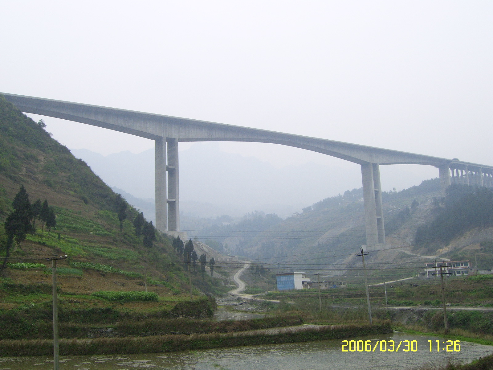 +整幅式連續(xù)剛構(gòu),其箱梁截面為單箱單室,頂板寬,底板寬,下部9#、10#兩個主墩為雙薄壁高墩,高度分別為、。該橋是國內(nèi)同類橋梁中罕見的集高、艱、難、險于一體的工程,主跨跨度的整幅式單項單室堪稱全國之最。實踐證明,該橋的施工離不開科技創(chuàng)新,通過施工,總結(jié)出了一套省內(nèi)大跨度整幅式單箱單室三向預(yù)應(yīng)力連續(xù)剛構(gòu)高速、優(yōu)質(zhì)、安全施工的新技術(shù)、新經(jīng)驗。通過驗證,各項技術(shù)指標(biāo)均符合設(shè)計要求,全橋接縫平順,線型美觀。同時,施工中,自行研制了自錨式三角形掛籃,其結(jié)構(gòu)簡單,加工拼裝方便,采用液壓走行即快速又安全,剛度大,變形小,模板移動靈活,內(nèi)模板脫模立模移動快速方便,掛籃施工安全可靠。還總結(jié)了一套具有國內(nèi)先進水平的大跨度連續(xù)剛構(gòu)施工線型控制技術(shù)和應(yīng)力監(jiān)測技術(shù),利用此套技術(shù),對大跨度連續(xù)剛構(gòu)橋進行控制,保證了全橋高精度合攏,合攏誤差最大不超過,梁部各截面應(yīng)力值與設(shè)計相符,全橋質(zhì)量優(yōu)良,線型美觀。另,還對“機制砂高性能泵送混凝土的配制技術(shù)”進行了研究并取得了成果,施工過程中混凝土的各項性能均符合設(shè)計和施工要求,該項技術(shù)在國內(nèi)建筑市場處于領(lǐng)先水平,也為國內(nèi)河砂缺乏省份澆筑高標(biāo)號高性能混凝土開創(chuàng)了先河,并獲得了2005年陜西省職工經(jīng)濟技術(shù)創(chuàng)新優(yōu)秀成果三等獎。韓家店I號特大橋的施工受到了貴州省交通廳等各方的極大關(guān)注,通過科技攻關(guān)和全體員工的努力,強化施工現(xiàn)場管理,于2005年底順利完工,施工過程中積極采用新技術(shù)、新材料、新工藝,為連續(xù)剛構(gòu)施工探索出了一套先進、科學(xué)的施工方法,加快了施工速度,保證了工程質(zhì)量和施工安全,填補了貴州省內(nèi)多項空白,整套技術(shù)——“崇遵高速公路大跨預(yù)應(yīng)力箱型連續(xù)剛構(gòu)橋施工技術(shù)”獲得了集團公司2006年度科技進步一等獎。